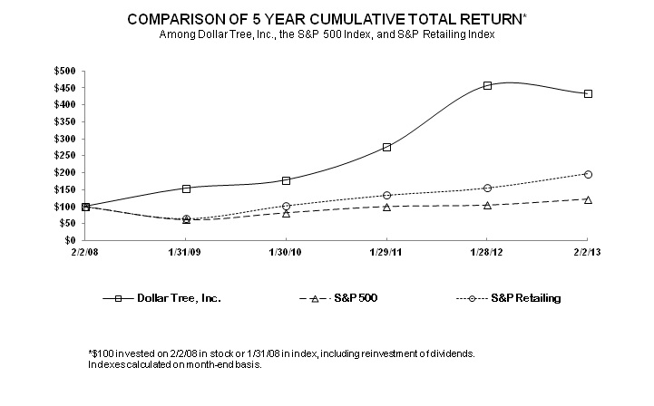 INTRODUCTORY NOTE: Unless otherwise stated, references to "we," "our" and "Dollar Tree" generally refer to Dollar Tree, Inc. and its direct and indirect subsidiaries on a consolidated basis. Unless specifically indicated otherwise, any references to “2013” or “fiscal 2013”, “2012” or “fiscal 2012”, “2011” or “fiscal 2011”, and “2010” or “fiscal 2010”, relate to as of or for the years ended February 1, 2014, February 2, 2013, January 28, 2012 and January 29, 2011, respectively.